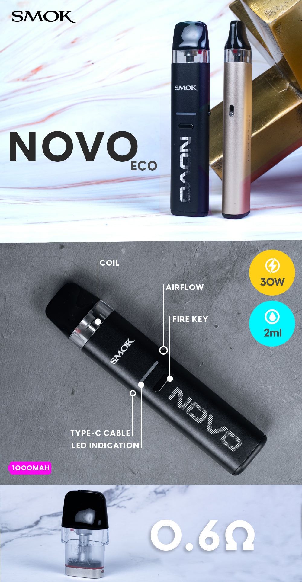 SMOK NOVO ECO 30W POD KIT FEATURES: